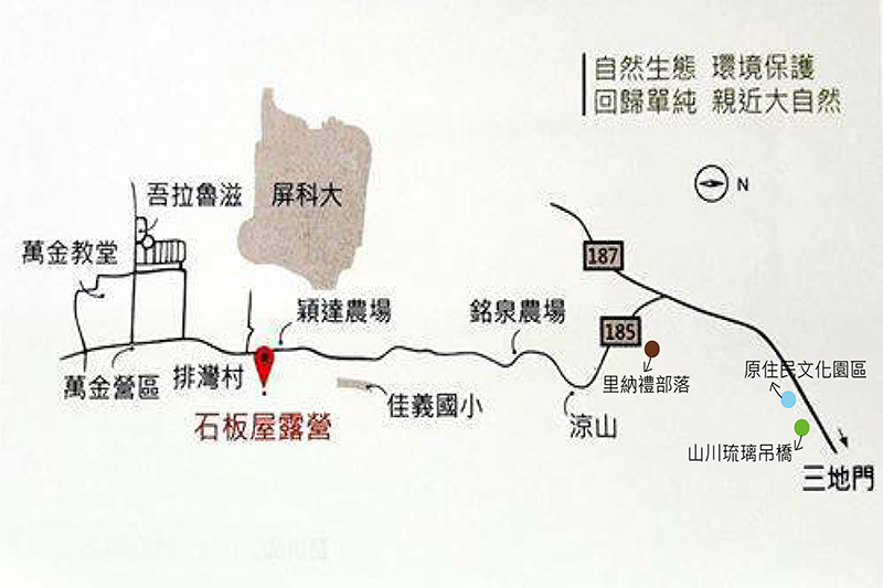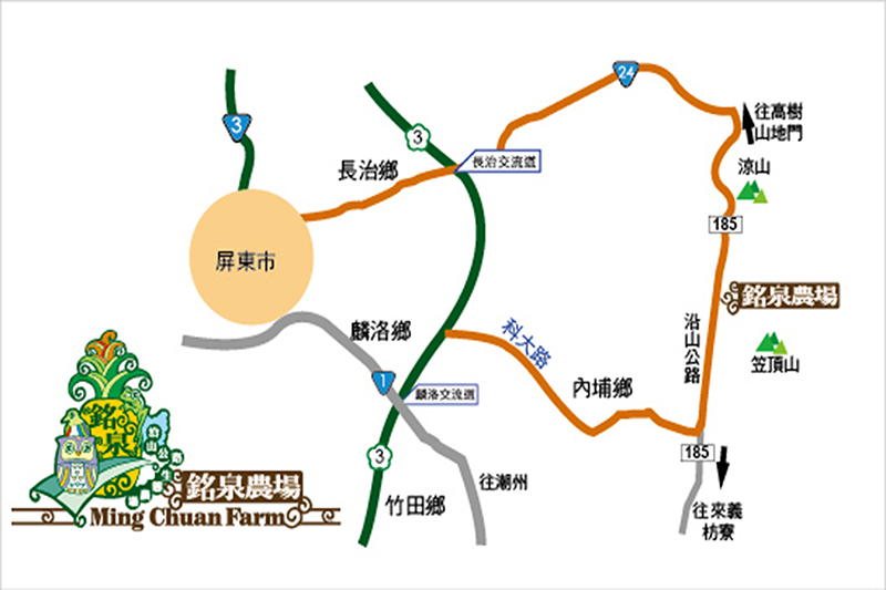 2.北上:國道3號由麟洛交流道下,續接屏37線(信義路)右轉科大路走到底左轉屏187線,遇7-11(老埤店)右轉後直走到底,遇紅綠燈左轉接屏185線可抵達農場。